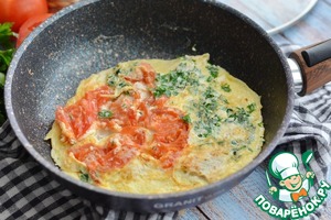 Сверху выложите ломтики помидора и немного свежей зелени. Поджарьте бризоль с одной стороны до лёгкого золотистого цвета
