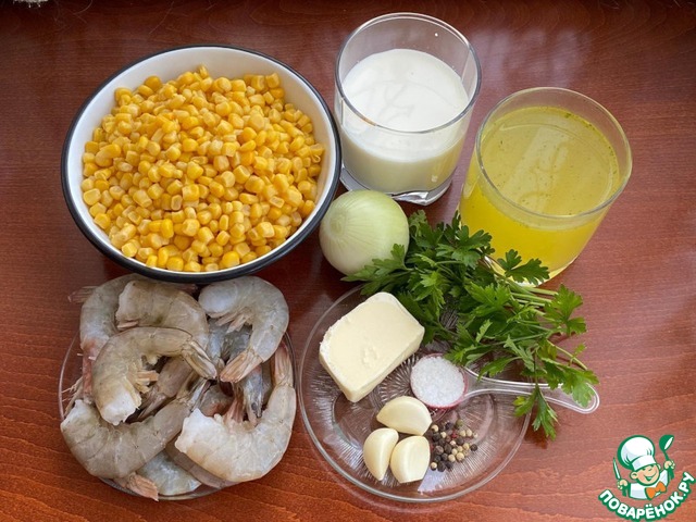 Ингредиенты для «Кукурузный крем-суп с креветками»: