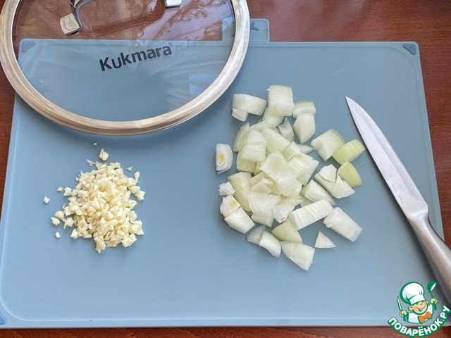Луковицу и чеснок нашинкуйте. Сильно мелко шинковать не обязательно, потому что все будем измельчать блендером.
