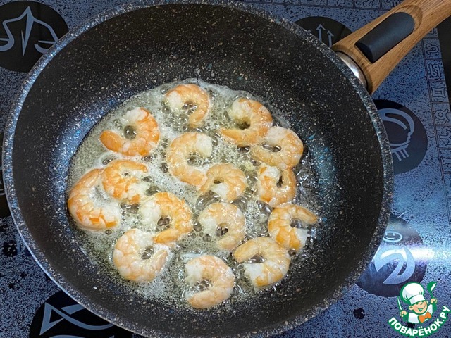 Обжарьте креветки до готовности, посолите. Готовые креветки переложите на блюдо. Или как вариант, креветки можно отварить в подсоленной воде, а затем обжарить.