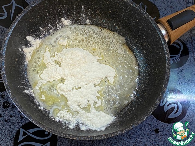 В сковороду ТМ Kukmara, где обжаривались креветки всыпьте 2 ст. л. муки и слегка обжарьте.