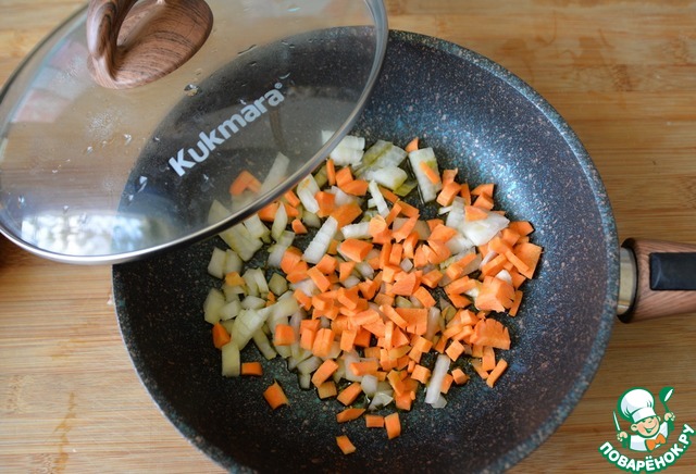 Берём сковороду от Kukmara. Наливаем масло. В этой сковроде можно жарить при минимуме масла, и еда не пригорит. Нагреваем, кладём порезанные лук и морковь, обжариваем на среднем оне 2 минуты.