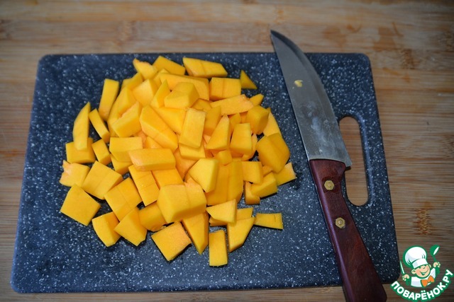 Тыкву чистим, режем кубиками, вкус супа также зависит от сорта тыквы и её сладости.
