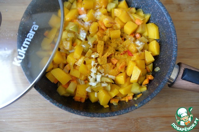 Кладём тыкву на сковроду, обжариваем 5 минут на среднем огне.
