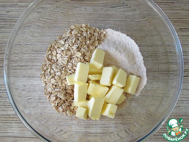 Для посыпки смешать овсяные хлопья, муку и щепотку соли со сливочным маслом.