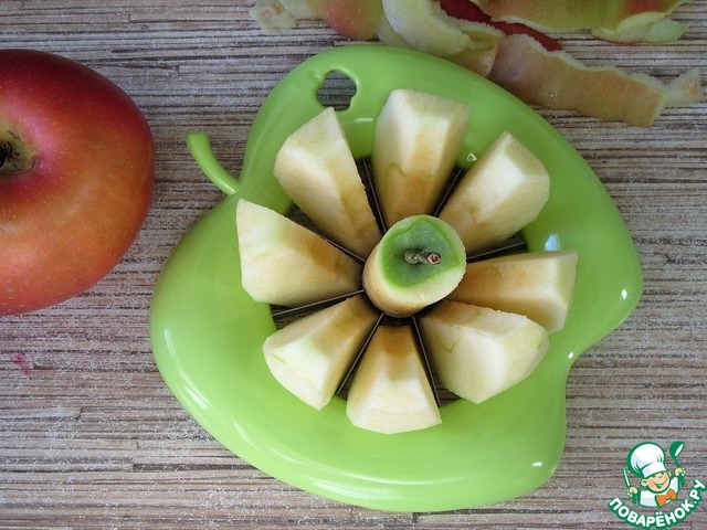 Яблоки очистить от кожуры, разрезать на 8 частей, вырезав сердцевину. Каждую часть разрезать на 3-4 кусочка.