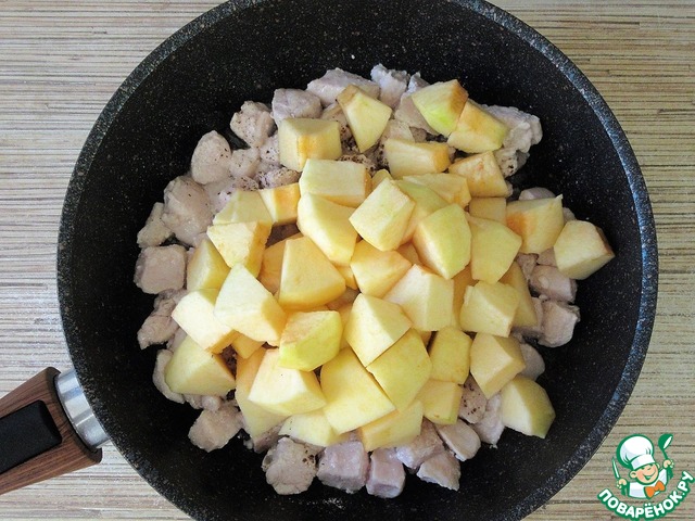 Куриное филе нарезать средними кусочками, примерно как яблоки, обжарить на 2 ст. л. растительного масла до изменения цвета. Посолить, поперчить по вкусу.