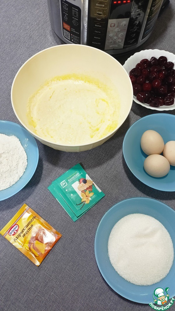 • Продолжаем готовить тесто: добавляем муку, разрыхлитель и ванилин — до однородного состояния. Взбиваем все это миксером 1-2 минут. Обсыпаем вишню мукой (уйдет 5-10гр) и, отправляем в тесто. После чего нежно перемешиваем ложкой.