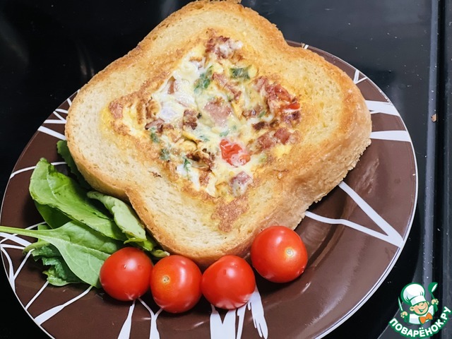 Смесь жидкая, так и норовить вытечь, поэтому мой совет прижмите ломтик к сковороде на пару секунд, чтобы яйцо схватилось.