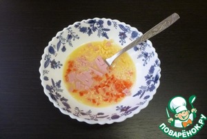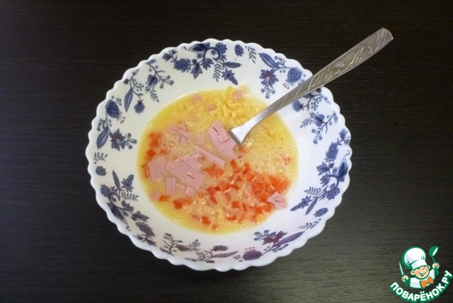 Яйца разболтать вилкой. Добавить мелко нарезанные сладкий перец, сыр, вареную колбасу. Зелень нарезать и тоже положить в яйца. Посолить и поперчить по вкусу.