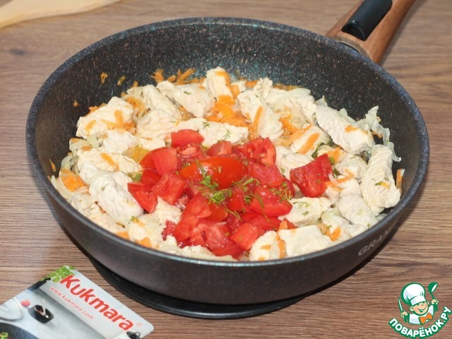 Готовила в сковороде бренда Kukmara. Сковорода с утолщенным дном и стенками, которые обеспечивают равномерный нагрев и долго сохранят теплым блюдо. Удобная, стильная со съемной ручкой сковорода - что можно использовать для духовки. Ручка крепится на спец. зажиме, что облегчает готовку блюда по времени. Т. е. не надо бежать за отверткой и откручивать ручку.