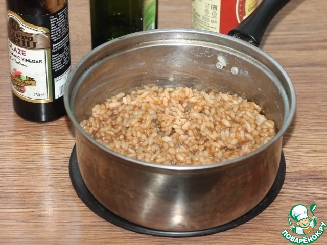 13. В готовый рис (без жидкости), добавляем оливковое масло, соевый соус и бальзамик, перемешиваем.