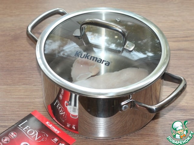1. Филе индейки промываем, кладем в кастрюлю и заливаем водой (1,5 л). На среднем огне, доводим воду до кипения и удаляем накипь (пену).