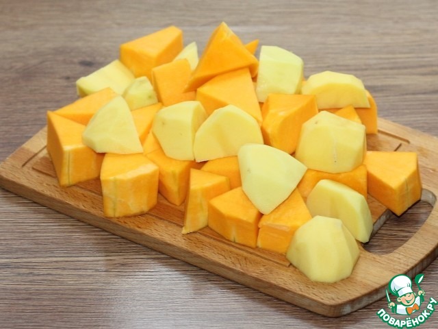 2. Овощи очищаем от кожуры и удаляем из тыквы семечки, используя столовую ложку.