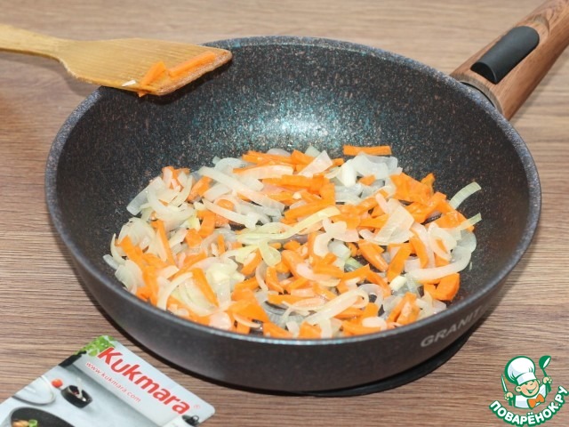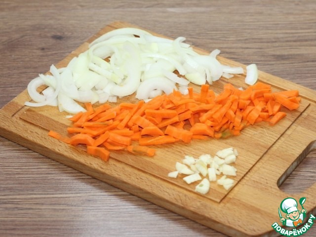 5. Приготовим зажарку. Лук нарезаем полукольцами, морковь - соломкой и мелко рубим чеснок.