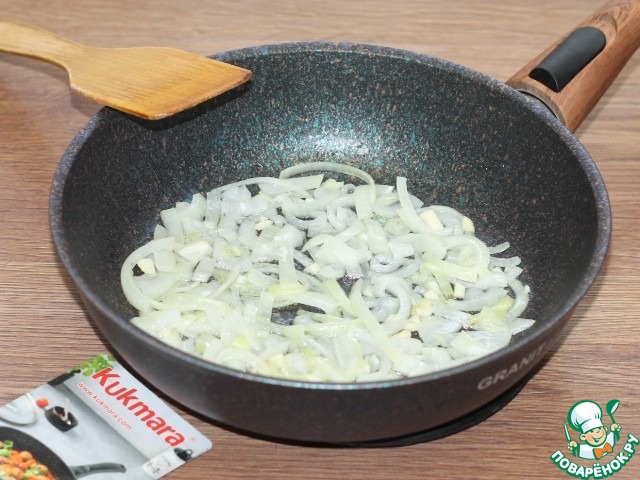 6. На разогретом растительном и сливочном масле обжариваем лук и чеснок, 2-3 минуты.