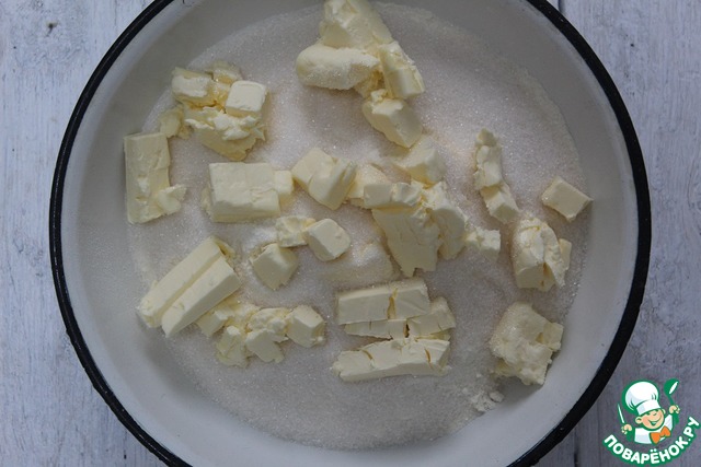 В чашу всыпать муку и сахар, положить нарезанное кубиками холодное сливочное масло.