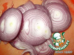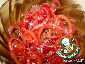 Лук обдаем кипятком и маринуем минут 15 в оливковом масле, бальзамическом уксусе и соевом соусе (я еще добавила несколько капель лимонного сока, это дело вкуса, я люблю лук покислей).
