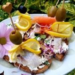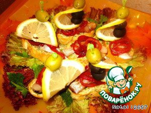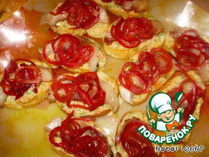 Филе нарезаем на небольшие ломтики. Их укладываем на бутербродики. -