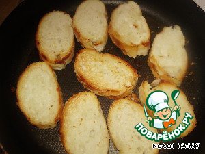 Багет (или батон, а также вкусно и с бородинским хлебушком) режем на ломтики и обжариваем на сковороде на медленном огне (чтоб слегка подсушился) до золотистого цвета с наименьшим количества масла растительного.