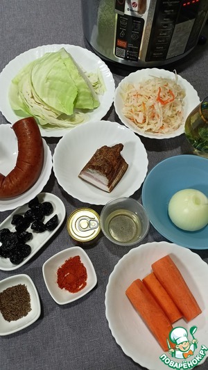Мелко шинкуем лук, морковь и капусту. Сало и краковскую колбасу режем соломкой. Чернослив просто режем пополам.