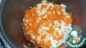 Отправляем в чашу масло, лук и морковь — Режим «Жарка» 8 минут (Не забываем перемешивать каждые 2-3 минуты)