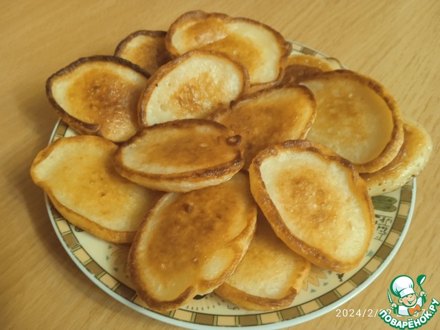 Тесто аккуратно набирать с края тарелки, выкладывать на разогретую с растительным масло сковороду, огонь при этом средний. Обжаривать с двух сторон до зарумянивания.