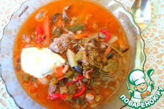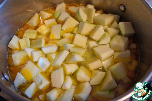 Затем добавить кабачки и томить при слабом кипении до мягкости последних.