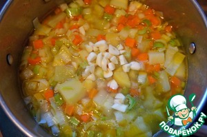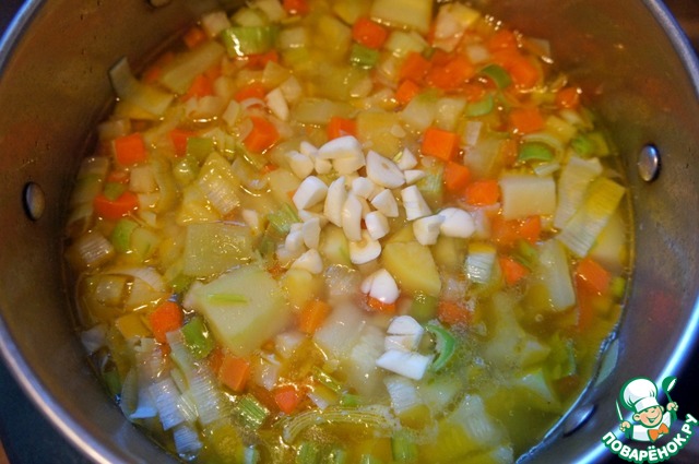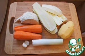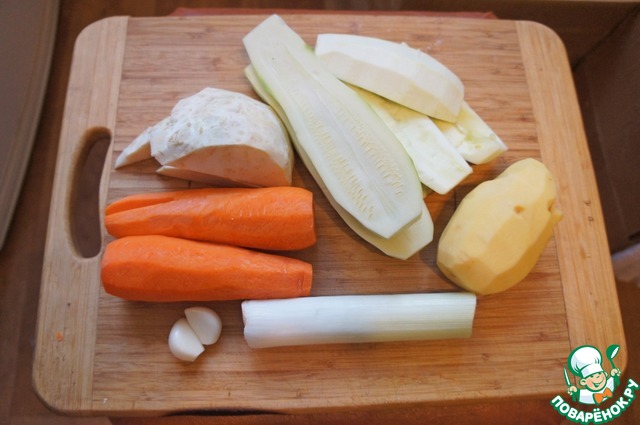 Подготовить овощи, тщательно вымыть и очистить. Вес овощей дан в уже почищенном виде. Нарезать: морковь, сельдерей и картофель небольшими кубиками, кабачок средними кусочками, лук и чеснок измельчить.