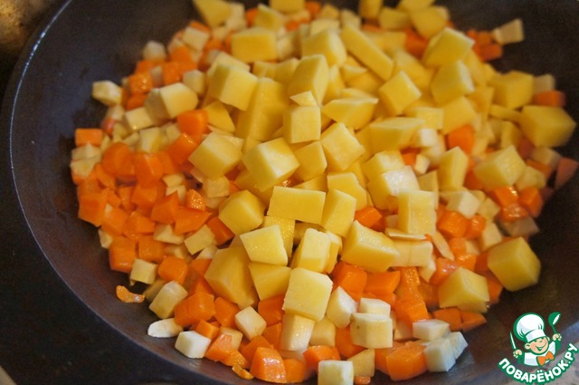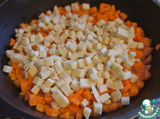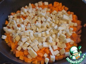 Добавить сельдерей, обжаривать ещё 3 минуты,