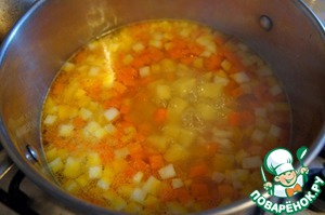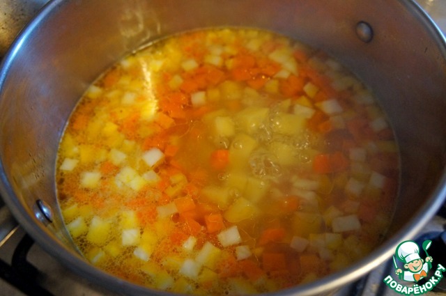 Переложить зажарку в кастрюлю и влить 800 г горячей воды. Посолить, поперчить. Довести до кипения и варить на маленьком огне 5 минут.