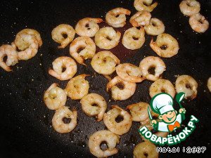 Креветки очистить от панциря и обжарить на оливковом масле до золотистой корочки.