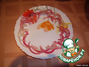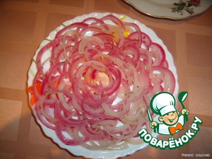 Маринованный лук выкладываем на тарелку, начиная от края.