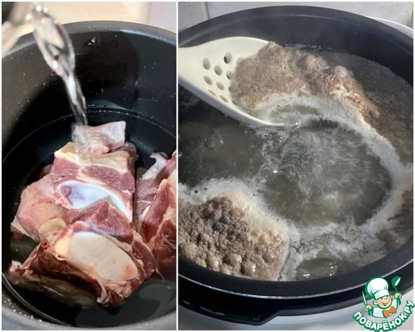 • Говядину порубил я на крупные куски и залил холодной водой. Потом довел до кипения на сильном нагреве и с появлением пены, которую, конечно, надо снять, нагрев убавил. Если пена продолжит выделяться, снимать ее, пока не перестанет … выделяться.