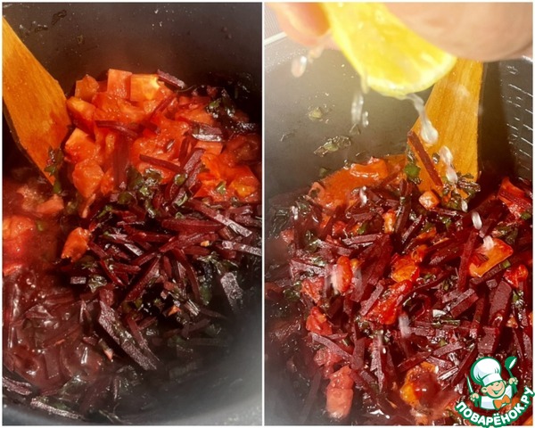 • Пару крупных, созревших окончательно, настоящих помидоров надо ошкурить, нашинковать кубиками и к свёкле добавить. Ложку столовую сахара и половинку лимона выдавить. Я еще граммов сто бульона добавил. Сверху жирок снял.