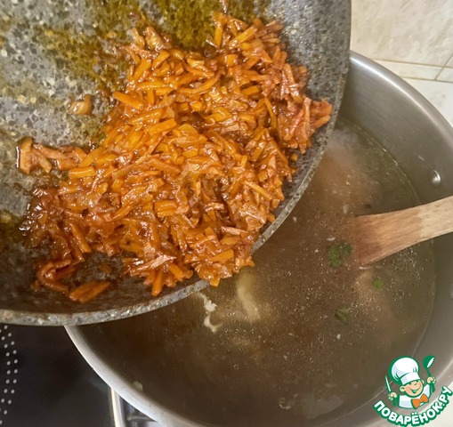 • А пока в бульон отправить луково-морковно-тома тную заправку.