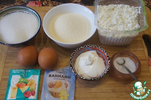 В творожную массу всыпать манную крупу, разрыхлитель и щепотку ванилина.
