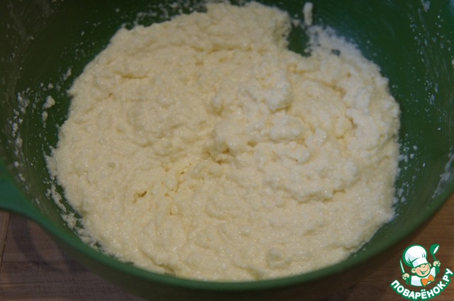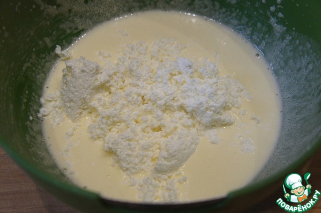 К сметанно-яичной массе добавить протёртый творог. Перемешать миксером до однородности.