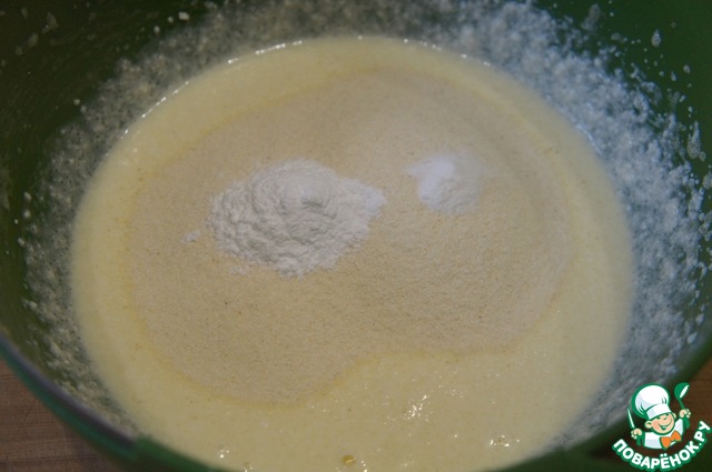 Все тщательно перемешать лопаткой до однородности и отставить в сторону, для того, чтобы манка слегка набухла.