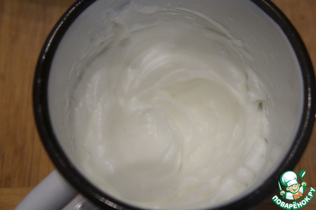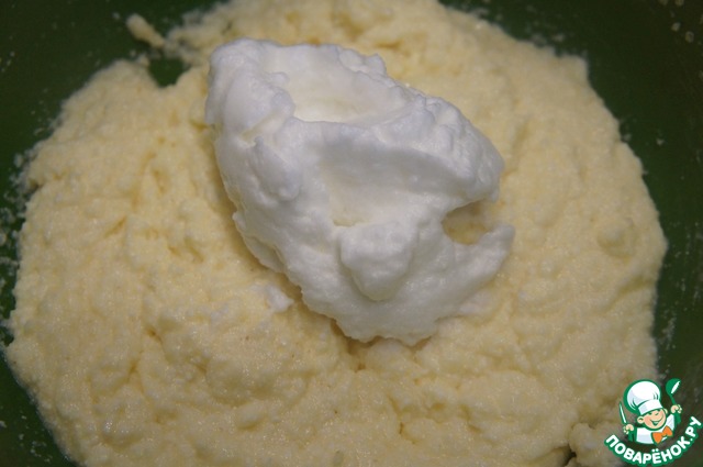 Взбитые белки частями добавить к творожной массе, каждый раз аккуратно перемешивая лопаткой.