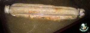 Дальше я взяла 4 небольших шампура, можно взять деревянные шпажки или палочки, с четырех сторон вокруг рулета пристраиваем шампура, и с боков перетягиваем резинкой или веревкой.