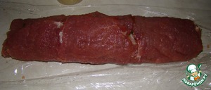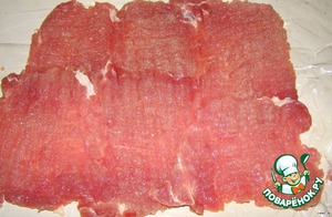 Отбейте хорошенько мясо. Я брала нежирную свинину, резала на куски не больше одного см и хорошо отбила. Выкладываем мясо на пленку, краями внахлест, и еще немного отбейте именно в местах нахлестов. Заранее приготовьте посуду в которой будет вариться рулет, от этого зависит длина рулета.