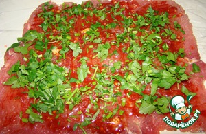 Мясо хорошенько посолите, поперчите, сверху мажем томатной готовой пастой с чесноком.