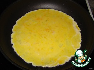 Делаем яичный блин из 1 яйца и столовой ложки молока, солим конечно же (тут тоже зависит от размера вашего рулета, если вы планируете большой сделать, то соответственно яиц больше).