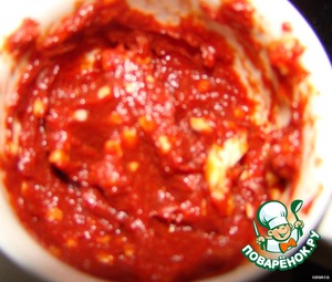 Берем ложку томатной пасты (с горкой). Покрошим туда чеснок, 1/2 чайной ложки сахара, и чайную ложку уксуса. Ну и по собственному вкусу какие угодно специи.