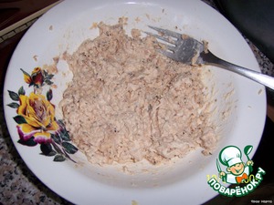 Третий слой - рыбную консерву (слить масло), потолочь вилкой и смешать с майонезом.