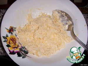 Сыр потереть на мелкой терке и смешать с майонезом. Выложить следующим слоем. Слой крекеров.