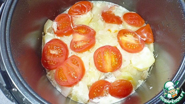 Выливаем в чашу воду. Укладываем на дно чаши картофель и посыпаем третью лука. Далее слой минтая и еще треть лука. Потом следует картофель в майонезе и остатки лука. Сверху покрываем все кольцами помидор - Режим "Тушение" 60 минут.