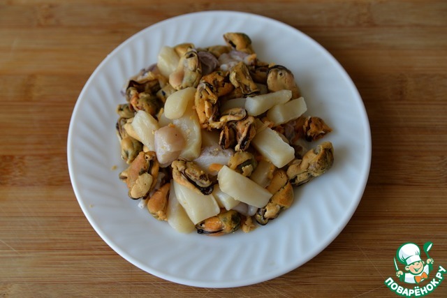 Перемешиваем морепродукты с овощами и тушим при открытой крышке на среднем огне 5 минут. Больше нет необходимости, иначе они станут "резиновыми".