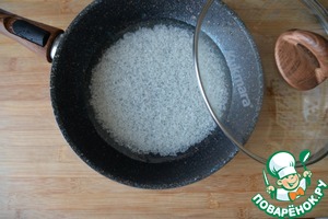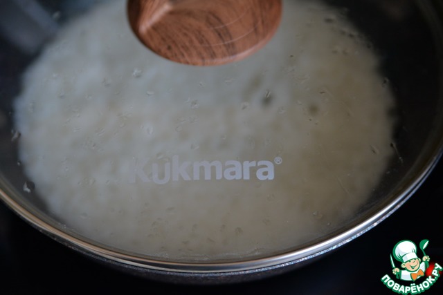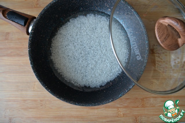 Сначала варим рис. Рис тщательно промываем. Для варки я использовала сковороду ТМ KUKMARA. Как оказалось, это очень удобно. Кладём рис в сковороду, наливаем воды на одну фалангу выше риса. Ставим на огонь. Сковорода быстро нагрелась и долго держала тепло.